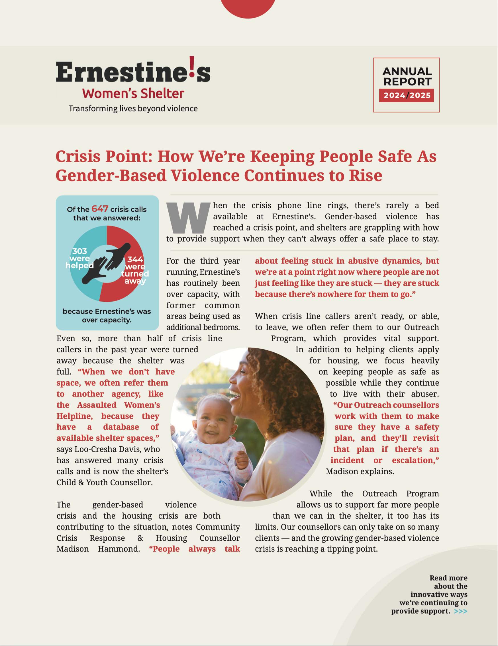 For more than 40 years, Ernestine’s has been a place of safety, healing, and hope for adults, and their children, who are fleeing violence. Through our wraparound support — including emergency shelter, crisis counselling, housing and legal advocacy, child and youth programs, and long-term community-based support — individuals and families are empowered to rebuild their lives.